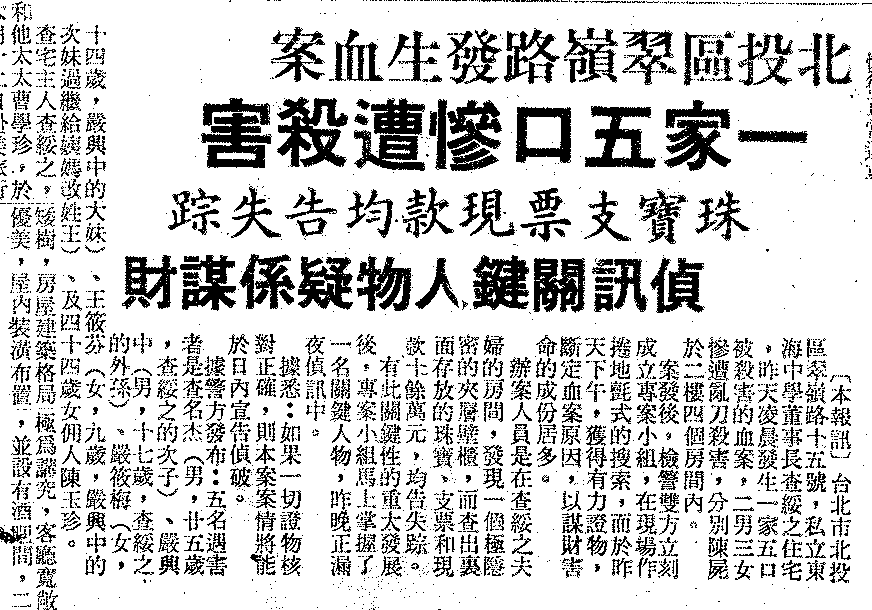 住在北投區翠嶺路15號的豪宅中人,是私立東海中學董事長查綏之一家。查綏之與他的妻子曹學珍在1974年4月22日前往美國考察旅行,因此不在家;他的長女查名婉、長子查名仁雖然也住在這裡,但剛好4月26日晚上都有事外出,躲過了劫難。其他的孩子若不是在服兵役,就是待在國外。