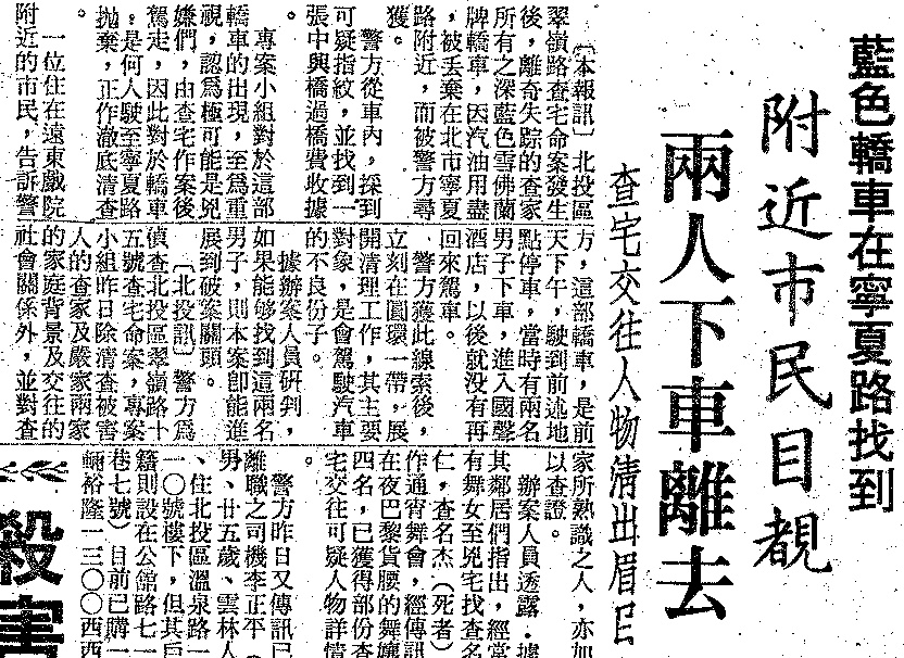 藍色雪佛蘭轎車很快就在寧夏路被找到,這台車汽油用盡,被拋棄在寧夏路附近,上面有一些可疑指紋,以及一張中興橋過橋收據。有目擊者出面指認,曾看到兩名男子開這台轎車,把車停好後走進國聲酒店,之後就再也沒有回來駕車。警方研判,這兩人就是查宅的兇手。