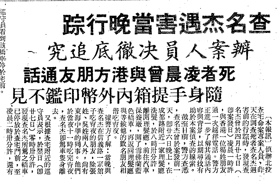 警方鎖定了這個方向,詳細徹查查名杰當晚的行蹤,他們發現他在4月26日當晚,先是去理髮廳洗髮,再到汽車維修廠取回藍色雪佛蘭,與張姓、吳姓好友及東海中學同事們去吃宵夜,直到11點才駕車離去。到了27日凌晨12點30分左右,已經有巡守員看到那台車停在查宅門口,一直到凌晨2點半都還在。另外,查名杰總是隨身攜帶的一只零零七公事包,在他死時就放在他的身邊,然而公事包遭到撬開,裡面裝的財物、印鑑等物已不翼而飛。