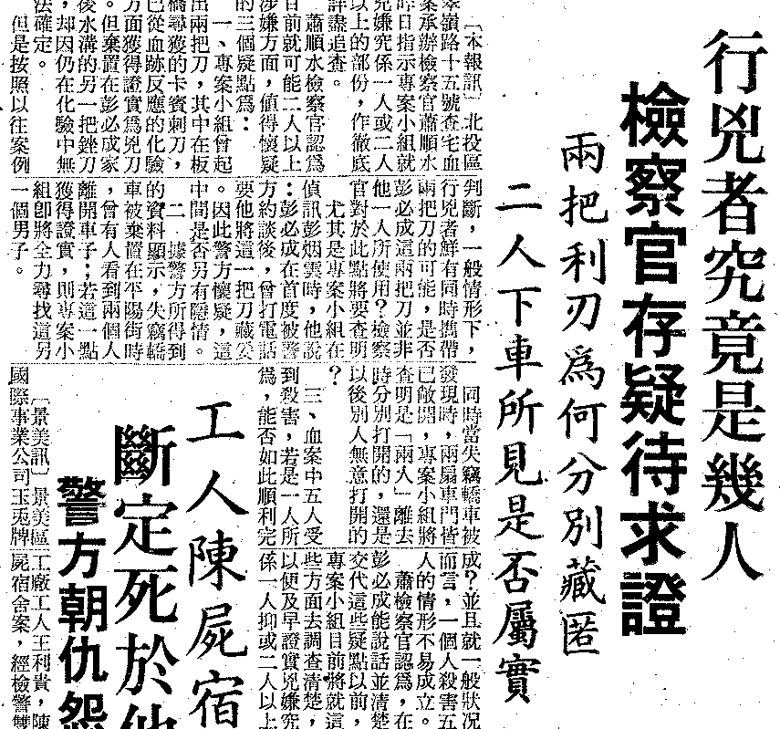 本報訊,〈行兇者究竟是幾人 檢察官存疑待求證 兩把利刃為何分別藏匿 二人下車所見是否屬實〉,《中國時報》,1974年5月6日。