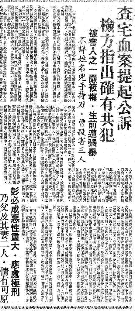 本報訊,〈查宅血案是否有共犯 調查重點針對彭必炎〉,《中國時報》,1974年5月9日。