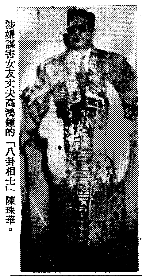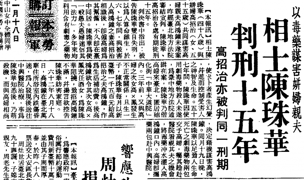 本報訊,〈以毒藥謀害姘婦親夫 相士陳珠華判刑十五年 高招治亦被判同一刑期〉,《中央日報》,1974年11月19日。