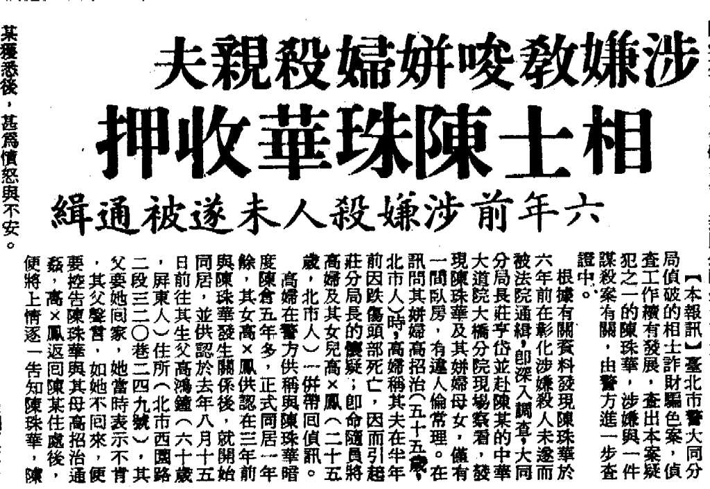本報訊,〈涉嫌教唆姘婦殺親夫 相士陳珠華收押〉,《中央日報》,1974年2月28日。