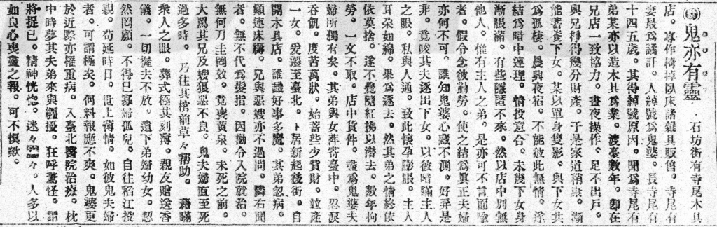 故事.圖片來源:《臺灣日日新報》漢文版1912年11月15日〈鬼亦有靈〉報導。