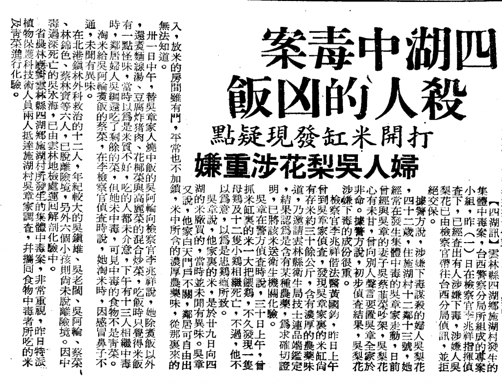 四湖訊,〈四湖中毒案 殺人的兇飯〉,《聯合報》,1967年2月2日。