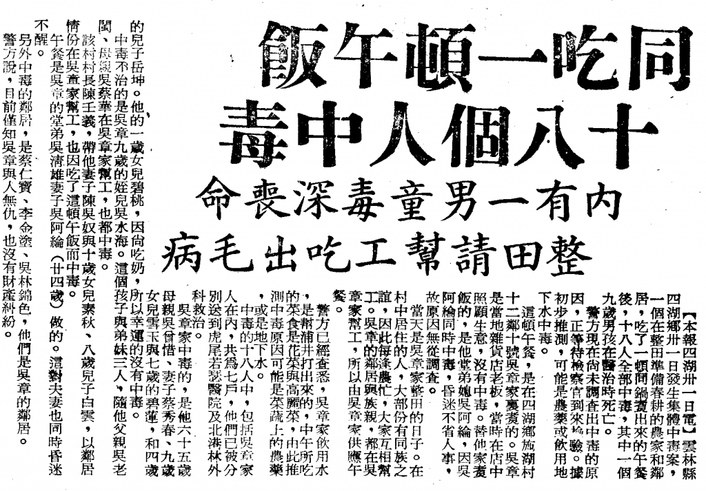 本報四湖卅一日電,〈同吃一頓午飯 十八個人中毒〉,《聯合報》,1967年2月1日。