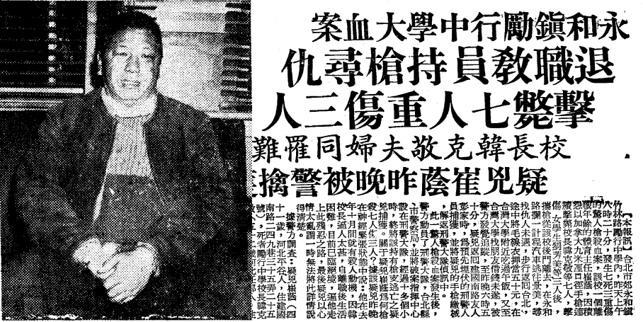 崔蔭走下樓梯,正好看見跟他有仇的事務主任應瑞昌從校門進來。「好小子!站著不要動!」崔蔭隨即向仇人大喊,把驚惶的應瑞昌逼到校門旁的轉角處,看他逃也逃不了,對準頭部把他射殺。