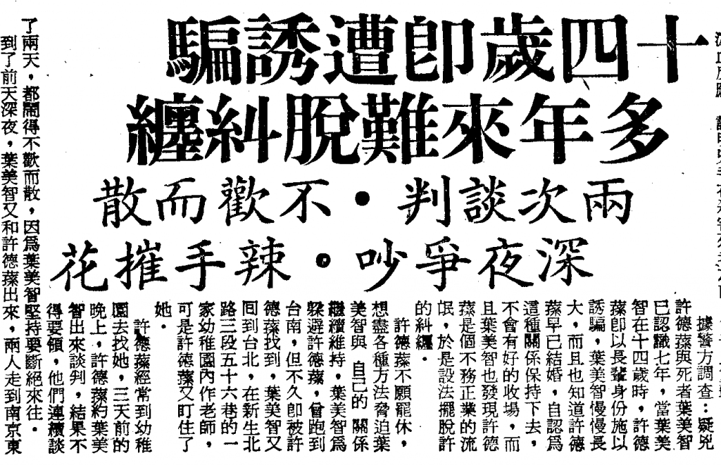 在葉美智父親不知道的情況下,年僅14歲的葉美智遭到34歲的許德蓀性侵害——也有另一說是遭到誘騙失身——無論是哪一種情況,葉美智都是受害者,因為她當年只有14歲。然而當年關於性犯罪的法規並不完備,葉美智更遭到許德蓀的威脅,說要是她把這件事告訴她父親,許德蓀就要拿手榴彈炸死她全家人,還會拿硫酸把她毀容。一個14歲的少女,很難抵抗這些暴力威嚇,只好忍氣吞聲,把許德蓀對她的暴行當成祕密,不讓家人知道。