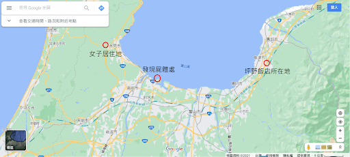 警方這時想起6年前(2014年)的一則線報,有3名居住在射水市的男子曾來告知警方,他們在這兩名女子失蹤的那一晚,曾在該市的海王丸公園聊天,看到有一台車停在公園內的港邊,車上有兩名女子。當這3名男子正想要上前搭訕車上的女子時,沒想到女子居然連人帶車爆衝掉進海裡,這3名男子表示當下因為太過害怕,就沒有立刻報警,直到多年後發現事態有異,因此還是決定告知警方當晚發生的事情。