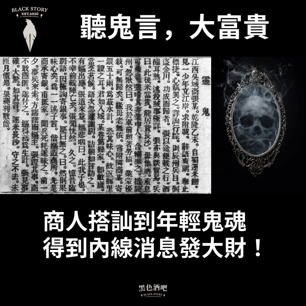 張某不免感到這番奇遇很驚人,他想到鬼少年曾告訴他去長沙賣米的建議,決定採信。於是他把手邊的米運到長沙,等了一段時間,米價果然飛漲,張某也發了大財。看看張某的經驗,哪天各位要是路上遇到鬼跟你報明牌,最好聽進去!