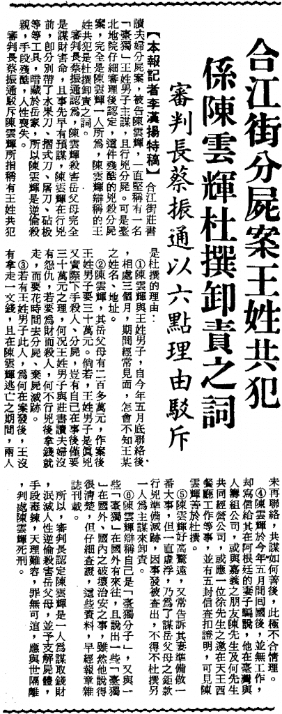 陳雲輝犯下如此滔天大罪,可以想見,等著他的刑罰就是死刑。一、二審時的他都被穩穩判了死刑,只差三審定讞,他就會被押上刑場執行。不過,因為二審時的法官採信陳雲輝有共犯的供詞,導致檢察官提出上訴,發回高等法院更審,這為陳雲輝帶來了一線生機。