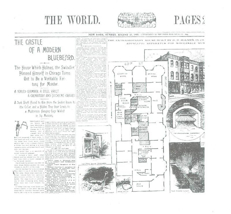 沒錯,整棟建物,表面上只是一棟廉價分租公寓,實際上卻是喪心病狂的屋主福爾摩斯醫生的殺人遊戲場,人稱「謀殺城堡」(The Murder Castle)!密室、密道方便福爾摩斯醫生在謀殺城堡中恣意穿梭,可以輕易潛伏獵殺被害人,再利用通往地下室的溜槽毀屍滅跡。由於福爾摩斯醫生與醫學院之間有所聯繫,他可以販賣屍體和骨骸到醫學院去,神不知鬼不覺地消滅證據。不知道有多少房客,在不知情的狀況下成了獵物,成為解剖室中無人認領的屍骨……
