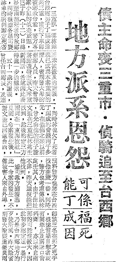 想不到,來討債的人一下車沒過五分鐘,還沒見到債務人,竟然就被一群凶神惡煞圍上,而且一句話也沒說,刀子就全往丁福成身上招呼過去。就在光天化日、眾目睽睽之下,丁福成被砍了好幾刀,當場慘死。謝義身為堂堂縣議員,面對如此殘暴的情境,也只能瞠目結舌、渾身哆嗦地癱在一旁,眼睜睜看著朋友被砍死。