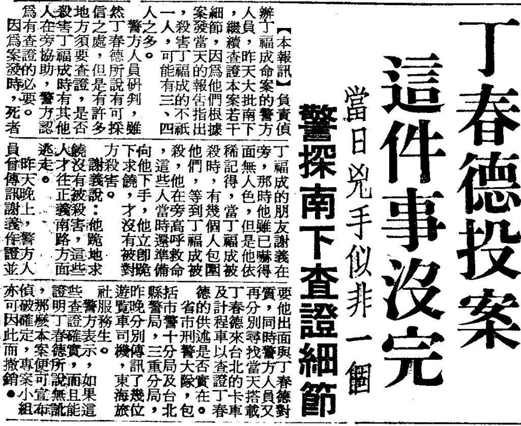 命案的主犯投案了,但並沒有解決全部的問題。打從一開始,這起命案就是在大白天的眾目睽睽之下,由「多人」所犯下。更不用說,死者丁福成身上的傷口,是多種凶器所造成的不同傷痕。再怎麼不濟的辦案人員,都會知道丁春德說的「一人做事一人擔」,完全是為了替其他人扛罪的說詞,而不是他真的一人犯下本案。