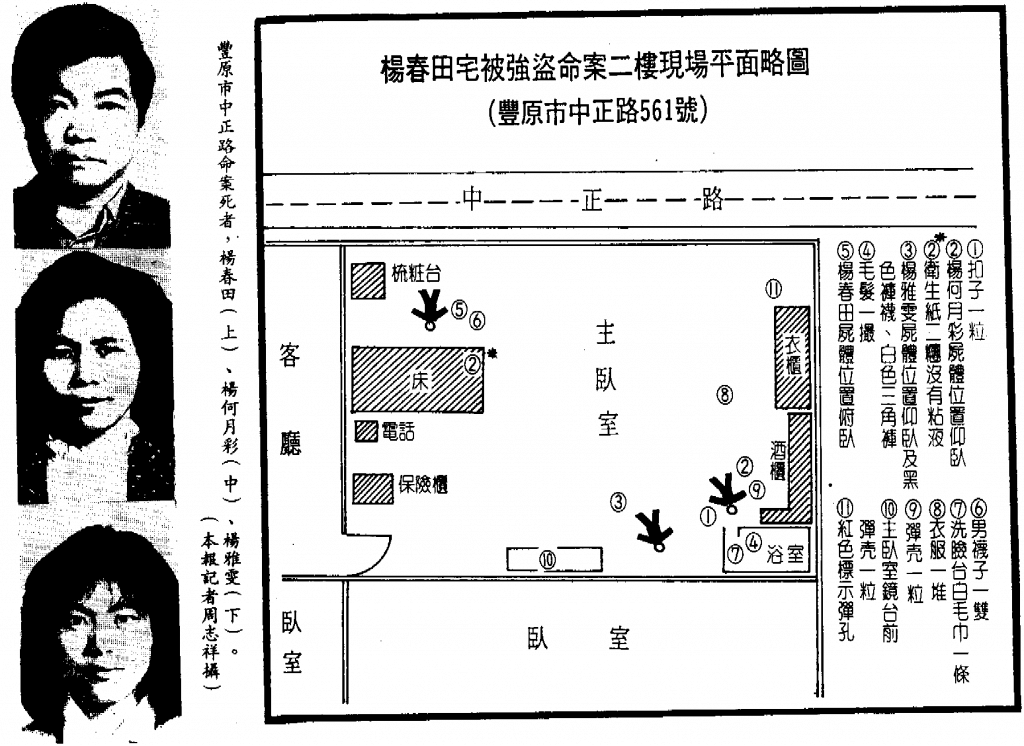 終於,周圍安靜下來,工人們研判歹徒應該已經走了,便奮力掙脫繩索膠布,重獲自由。他們鼓起勇氣上樓,走向老闆的主臥室,查看——那是一幅怵目驚心的畫面,地板上血跡斑斑,三具屍體倒在血泊中,正是老闆楊春田、他的妻子楊何月彩和女兒楊雅雯。楊春田與楊何月彩頭部中彈死亡,楊雅雯的頸部被砍三刀,大量失血致死。