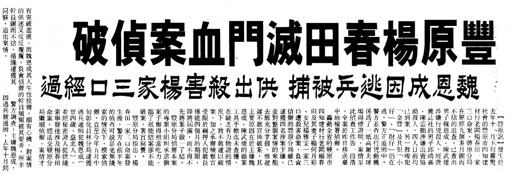 豐原滅門血案過了四年,台中縣警方仍然找不到犯案兇手,除了拿出他們逼魏恩成主演的劇本,其他一無所獲。不過,遠在台北市刑警大隊那方,倒是有了意外的斬獲。出名的殺人強盜管鐘演,就在1993年4月21日落網了。