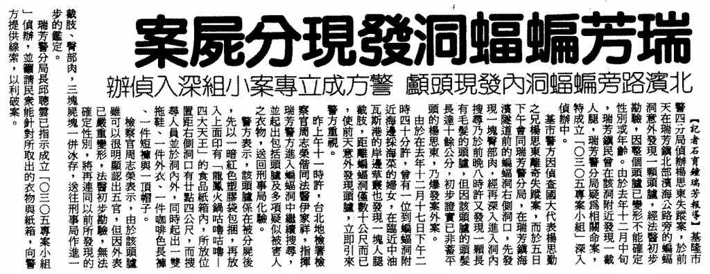 事實上,早在1992年12月,瑞芳分局就已經在蝙蝠洞外找到一個裝有人類大腿的袋子,但當時他們並沒有深入搜查,沒有發現蝙蝠洞裡還有更多的恐怖。綜合蝙蝠洞中的發現,警方推斷這些屍塊可能屬於一位無名死者,甚至兩位。這兩個人都不是他們要找的楊思東,但也暴露出這個社會中的失蹤人口,很有可能就是在此淒慘遇害、被分屍的受害者。然而,雖然找到了遺體,卻不知其身分,警方要調查也一時無從查起,只能期待有一天會有一線曙光,指示他們辦案方向……