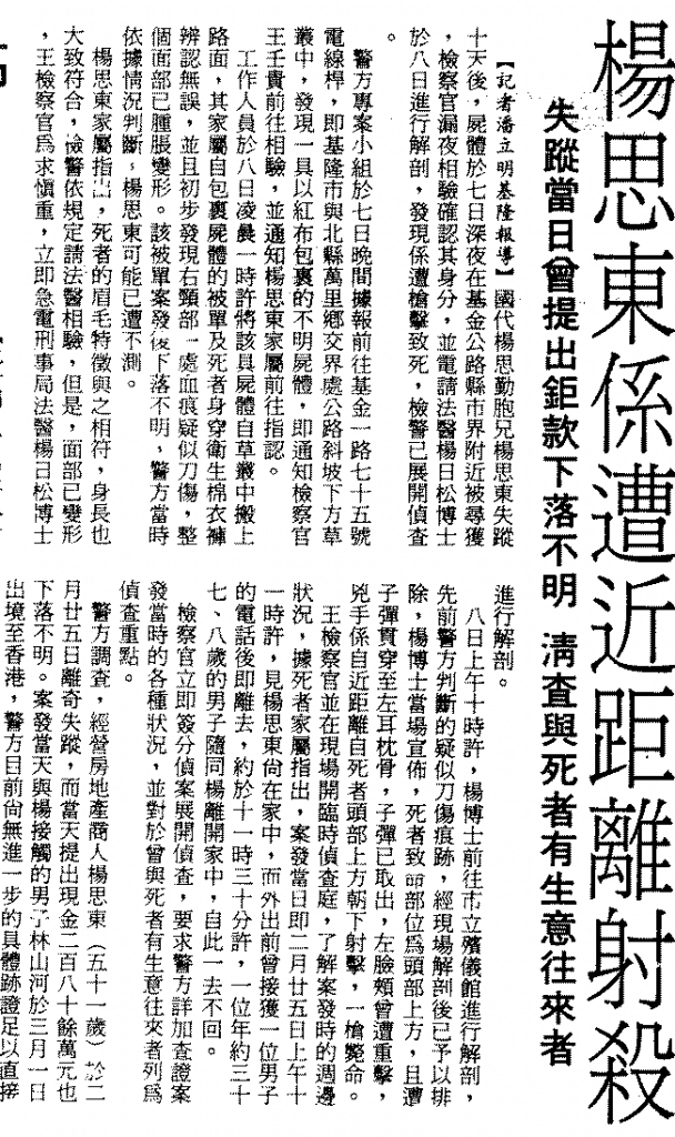 一口氣提領300萬元在身邊,這可是鉅款啊!我們不知道楊思東之子是否有試著警告父親這行為的危險性,但無論如何,楊思東還是做了。同一天,楊思東從第一銀行的基隆分行提領300萬元,從此之後,再也沒有人看見活著的他。