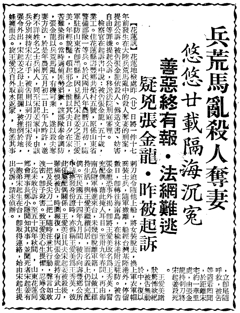 1965年,山東花蓮同鄉會會長鄭小隱,輾轉得知了這件事。正好,宋起姜的弟弟宋起生,人也待在台灣。於是鄭小隱從中牽線,讓宋起生與王愛美重新取得聯繫,並揭發了這起恐怖事件。宋起生為了替哥哥大嫂討公道,一狀把張金龍告上法院。